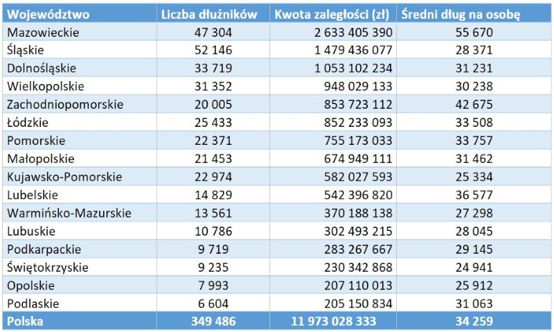 Najwięcej zadłużonych seniorów mieszka na Śląsku (51 077), natomiast najwyższe średnie kwoty zaległości (kredytowych i pozakredytowych) notuje Mazowsze;
