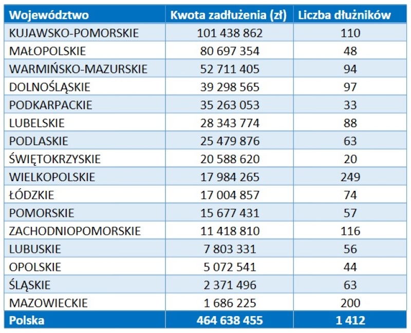 Według danych BIG InfoMonitor i BIK największe problemy finansowe firm z sektora upraw i hodowli mają te z woj. kujawsko-pomorskiego – ponad 101 mln zł. Na drugim miejscu jest Małopolska – około 80,7 mln zł, a na trzecim warmińsko-mazurskie – ponad 52,7 mln zł. Z kolei najwięcej firm-dłużników jest w Wielkopolsce – 249 podmiotów. Najlepsza kondycja rolników utrzymuje się na Mazowszu i Śląsku.
