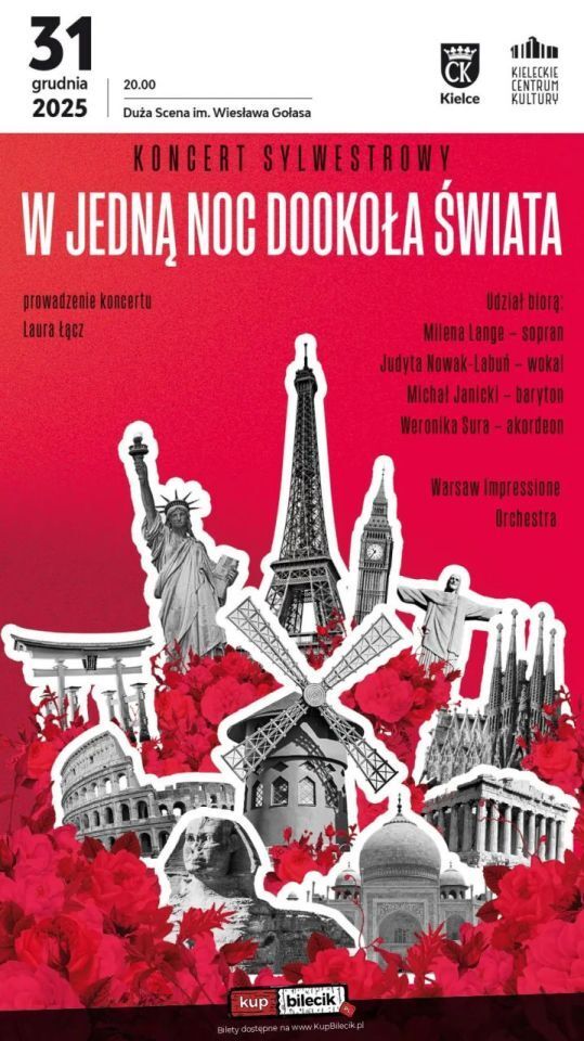 Koncert "W Jedną Noc Dookoła Świata". Niezwykła muzyczna podróż, która przenosi publiczność przez rozmaite kultury muzyczne, prezentując brzmienia z różnych stron świata, w tym muzykę polską, francuską, hiszpańską, meksykańską, argentyńską, grecką, włoską... W programie znajdą się najpiękniejsze arie i duety z oper, operetek i musicali, popularne piosenki oraz muzyka filmowa. Bilety do nabycia na: KupBilecik.pl