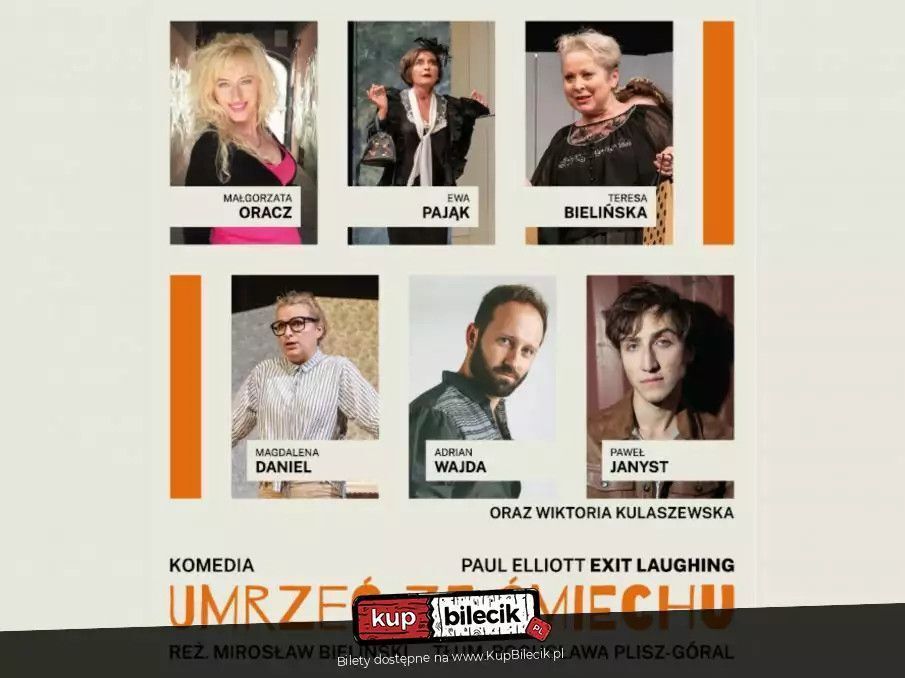 Potężna dawka dobrego humoru, nieoczekiwane zwroty akcji, błyskotliwe i pełne dowcipu dialogi, fantastyczna obsada to zagwarantuje Wam tylko teatr TeTaTeT w komedii Mirka Bielińskiego - Umrzeć ze śmiechu (Exit Laughing).