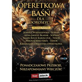 bilety: Drogie Panie, Szanowni Panowie - zapraszamy Was do świata, w którym muzyka uwodzi, zmysły tańczą, a rzeczywistość na chwilę ustępuje miejsca baśni. "Operetkowa Baśń dla Dorosłych" to koncert, który od lat zachwyca publiczność w całej Polsce - spektakl z pogranicza jawy i snu, gdzie elegancja łączy się z humorem, a klasyka z nowoczesną fantazją. To niezwykłe widowisko sceniczne w którym wzruszenie miesza się z uśmiechem. Scenę rozświetlają bajeczne kostiumy, pełne uroku choreografie i artyści, którzy nie tylko śpiewają, lecz także prowadzą widzów przez koncert jak przez magiczną opowieść. To koncert, który zaskakuje na każdym kroku. Publiczność - nie tylko słucha, ale współtworzy atmosferę. Od pierwszych taktów do ostatnich braw - jesteście częścią tej baśni. Występują: Operetkowa baśń dla dorosłych artyści: Joanna Wojtaszewska, Anna Jakiesz-Błasiak, Kamil Roch Karolczuk, Mikołaj Miko KrólMariaż gatunków muzycznych - operetki i musicalu w niezapomnianym koncercie, podczas którego przeniesiemy się na deski największych teatrów muzycznych, gdzie wyśpiewana miłość nie może równać się z żadną inną formą jej wyrażania. Doskonale dobrany repertuar to wspaniałe dzieła operetkowe i największe hity kultowych widowisk muzycznych. Znakomite aranżacje wielokrotnie nagradzanych utworów, choreografia i zjawiskowe kreacje wprowadzą w niepowtarzalny klimat. Bilety do nabycia na: KupBilecik.pl |