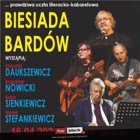 bilety: Uczta literacko-kabaretowa, czyli… BIESIADA BARDÓW. Bilety do nabycia na: KupBilecik.plTo kabaretowy koncert literacko - satyryczny, wypełniony kultowymi piosenkami i tekstami najwybitniejszych polskich bardów okraszonych zabawną, zaskakującą, satyryczną narracją. Całość nawiązuje do tradycyjnych polskich biesiad poetyckich, w których w lekkiej, humorystycznej formie artyści odnoszą się do najbardziej żywotnych problemów współczesności. W koncercie usłyszymy wiele bardzo znanych piosenek, przebojów tego gatunku, w oryginalnym, autorskim wykonaniu. W koncercie udział biorą: KRZYSZTOF DAUKSZEWICZ - jego piosenki to przeboje kabaretowe, znane i cytowane jak hasła. Przed laty pisał listy do "Jaśnie wielmożnego pana Hrabiego", informując w kabaretowej formie o zmianach w naszym kraju. Dziś rozśmiesza do łez współczesną satyrą na nasze rodzime absurdy, a przede wszystkim na polską politykę. Wydał wiele płyt i książek. BOGUSŁAW NOWICKI - autor terminu "Piosenki z tekstem" i twórca własnych, bardzo osobistych ballad, które wydał na trzech płytach: "Ballady", "Oceany" i najnowszej " Optymizmu gram". Jego niezwykle komunikatywne piosenki mówią o człowieku, jego marzeniach i tęsknotach. Liryka miesza się z autoironią i humorem, wzruszenie z rozbawieniem. Jeśli są przeboje w tym gatunku to on napisał ich wiele. Gawędziarze, Uśmiechnięte dziewczyny, Poszukiwania do dziś śpiewane są przez "wędrownych gitarzystów". KUBA SIENKIEWICZ - kiedyś lider "Elektrycznych gitar", zespołu grającego pastiszowego rocka, autor wielu przebojów znanych z radiowych anten i filmu / Kiler/. Nagrał przeszło 10 płyt i cały czas pisząc znakomite piosenki przedstawia się jako czynny lekarz - neurolog, będąc wybitnym lekarzem neurologiem. MAREK STEFANKIEWICZ - znakomity pianista i kompozytor. Zaczynał w lubelskiej Budce Suflera. Nagrał tam trzy pierwsze płyty. Dziś zajmuje się również komponowaniem muzyki filmowej. Jego największe przeboje to "Jesteś lekiem na całe zło" i "Niech żyje bal". Obecnie jest także wykładowcą Wydziału Artystycznego UMCS w Lublinie oraz Akademii Teatralnej im. Aleksandra Zelwerowicza w Warszawie. Biesiada Bardów artyści: Bogusław Nowicki, Kuba Sienkiewicz, Krzysztof DaukszewiczZapraszam na prawdziwą ucztę literacko-kabaretową BIESIADA BARDÓW Koncert wypełnią kultowe piosenki z tekstami najwybitniejszych polskich bardów, okraszone zabawną, zaskakującą, satyryczną narracją. Całość nawiązuje do tradycyjnych polskich biesiad poetyckich, w których w lekkiej, humorystycznej formie artyści odnoszą się do najbardziej żywotnych problemów współczesności. Wystąpią: Krzysztof Daukszewicz - satyryk, poeta, kompozytor, gitarzysta i piosenkarz. Rozśmiesza do łez współczesna satyrą na nasze rodzime absurdy oraz politykę. Bogusław Nowicki - literat, autor tekstów kilkuset piosenek i utworów satyrycznych, kompozytor, wykonawca piosenki autorskiej. Autor niezwykłych piosenek, które mówią o człowieku, jego marzeniach i tęsknotach. Kuba Sienkiewicz- polski muzyk rockowy, wokalista i gitarzysta, autor tekstów, lider zespołu Elektryczne Gitary. Nagrał ponad 10 płyt, pisze cały czas znakomite piosenki. Kierownikiem muzycznym będzie Marek Stefankiewicz-znakomity pianista i kompozytor, znany z BUDKI SUFLERA. To będzie niezapomniany wieczór literacko-kabaretowy!!! ZAPRASZAMY Bilety do nabycia na: KupBilecik.pl |
