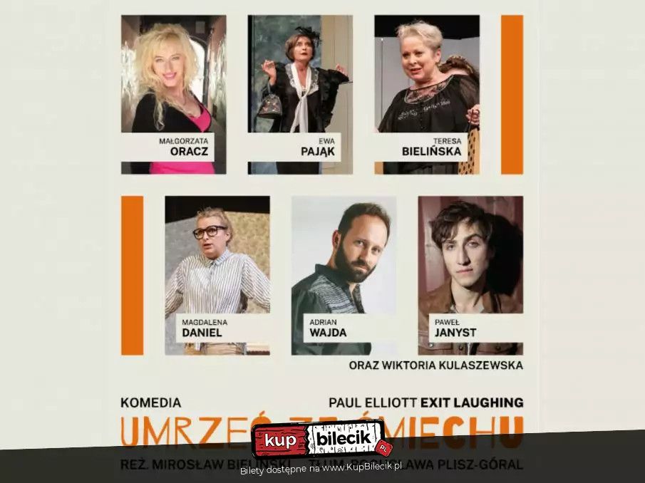 bilety: Potężna dawka dobrego humoru, nieoczekiwane zwroty akcji, błyskotliwe i pełne dowcipu dialogi, fantastyczna obsada to zagwarantuje Wam tylko teatr TeTaTeT w komedii Mirka Bielińskiego - Umrzeć ze śmiechu (Exit Laughing). To przezabawna sztuka, której głównym tematem jest przyjaźń czterech nietuzinkowych kobiet. Przyjaźń, której nawet śmierć nie jest w stanie zakończyć! "Jeśli przez ostatnie trzydzieści lat życia, największą przyjemnością czterech pań, była cotygodniowa, wieczorna gra w karty, fakt śmierci jednej z nich może być katastrofą. Jednak nie dla Connie, Millie i Leny. Te trzy damy z Południa, postanawiają urządzić "pożegnalny wieczór" swojej przyjaciółce Mary. "Wypożyczają" w sposób mało legalny prochy z domu pogrzebowego i rozpoczyna się impreza, po której nic już nie będzie takie samo." Reżyseria: Mirosław Bieliński Scenografia: Bożena Kostrzewska Kostiumy: Klara Kostrzewska Ruch sceniczny: Małgorzata Ziółkowska Muzyka: Paweł Piotrowski Projekcje: Grzegorz Kaczmarczyk Obsada: Connie: Teresa Bielińska Millie: Ewa Pająk Lena: Małgorzata Oracz Rachel: Magdalena Daniel / Aleksandra Sapiaska Bobby Grayson: Michał Chołka / Karol Czajkowski / Łukasz Oleś Czas trwania: 70 minut (bez przerwy). Spektakl dla widzów od lat 16! Bilety do nabycia na: KupBilecik.plUmrzeć ze śmiechu - Teatr TeTaTeT artyści: Marta Honzatko, Iwona Chołuj, Agnieszka Łopacka, Paulina Kajdanowicz, Michał KaszakJeśli przez ostatnie trzydzieści lat życia, największą przyjemnością czterech pań, była cotygodniowa, wieczorna gra w karty, fakt śmierci jednej z nich może być katastrofą. Jednak nie dla CONNIE, MILLIE i LENNY. Te trzy damy z Południa, postanawiają urządzić "pożegnalny wieczór" swojej przyjaciółce MARY. "Wypożyczają" w sposób mało legalny prochy z domu pogrzebowego i rozpoczyna się impreza, po której nic już nie będzie takie samo. Bilety do nabycia na: KupBilecik.pl |