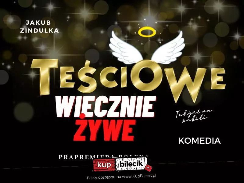 bilety: Jakub Zindulka - "Teściowe wiecznie żywe" (tłumaczenie: Jan Węglowski). To spektakl o relacjach między teściową a zięciem, synową a teściową, między matką a córką, synem a matką, między młodymi małżonkami i wreszcie, co najważniejsze, między samymi teściowymi! Porządna dawka humoru, świetne dialogi, ogromny ładunek emocji, od których może zakręcić się w głowie. Charyzmatyczne mamusie są jak ogień i woda - czy uda im się znaleźć wspólny język? Komedia, jakiej jeszcze nie znacie, która rozbawi Was do łez, bez względu na wiek! Zapraszamy na przezabawny spektakl w wyborowej obsadzie i najlepszym czeskim stylu! Reżyseria: Mirosław Bieliński Scenografia: Iwona Jamka Oprawa muzyczna: Wojtek Lisowicz Wizualizacje: Grzegorz Kaczmarczyk Prapremiera polska wrzesień 2022r. Obsada: Jindra Sedláková - Ewelina Gnysińska / Magda Szczepanek Karel Král - Karol Czajkowski / Łukasz Oleś Gene - Jana Sedláková - Teresa Bielińska Karla Králová - Ewa Pająk Bilety do nabycia na: KupBilecik.plTeściowe wiecznie żywe - Teatr TeTaTeT artyści: Ewelina Gnysińska, Magda Szczepanek, Karol Czajkowski, Łukasz Oleś, Jana Sedláková, Teresa BielińskaPorządna dawka humoru, świetne dialogi, ogrom emocji, od których może zakręcić się w głowie. Charyzmatyczne mamusie są jak ogień i woda - czy uda im się znaleźć wspólny język? Komedia, jakiej jeszcze nie znacie, która rozbawi Was do łez, bez względu na wiek! Zapraszamy na przezabawny spektakl w wyborowej obsadzie i najlepszym czeskim stylu! Bilety do nabycia na: KupBilecik.pl |