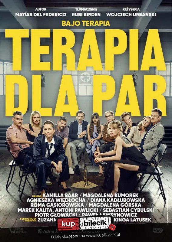 bilety: Czy kiedykolwiek przyszło Ci do głowy, żeby pójść na terapię? A może wolisz... terapeutyzować się w teatrze? Przygotuj się na fenomenalną, wybuchową i szalenie fantastyczną historię, która rozgrzeje Cię do czerwoności. Trzy skrajnie różne związki trafiają na wspólną sesję, by poskładać swoje uczucia. Zamiast spokojnej rozmowy, czeka na nich prawdziwy rollercoaster wyznań, pretensji i zaskakujących sojuszy. Z pozoru zwyczajne problemy wywołają lawinę śmiechu lub odkryją niepokojącą prawdę! Terapia teatralna w komediowym wydaniu. "Terapia dla par" to niesamowita, wyrazista sztuka, która łączy błyskotliwy humor z celnością obserwacji. Porywająca podróż przez miłość, kompromisy i szanse na nowy początek. Gwiazdorska obsada rozbawi Cię do łez i sprawi, że spojrzysz na swoje relacje z zupełnie innej perspektywy. Przyjdź do teatru i przekonaj się, jak "Terapia dla par" może odmienić Twoje spojrzenie na miłość i relacje! Terapia dla par artyści: Kamilla Baar, Roma Gąsiorowska/ Magdalena Górska, Agnieszka Więdłocha/ Diana Kadłubowska i inniTrzy skrajnie różne związki trafiają na wspólną sesję, by poskładać swoje uczucia. Zamiast spokojnej rozmowy, czeka na nich prawdziwy rollercoaster wyznań, pretensji i zaskakujących sojuszy. Z pozoru zwyczajne problemy wywołają lawinę śmiechu lub odkryją niepokojącą prawdę! Bilety do nabycia na: KupBilecik.pl |